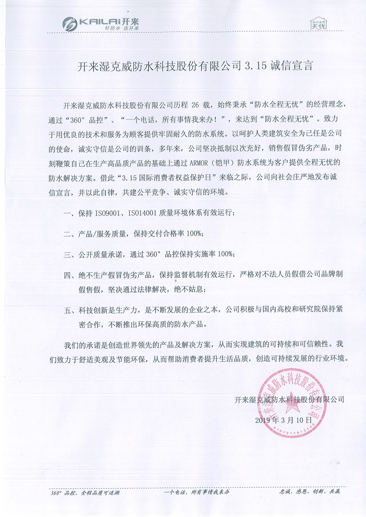 開來濕克威防水科技股份有限公司歷程26載,始終秉承“防水全程無憂”的經營理念,通過“360°品控”、“一個電話,所有事情我來辦!”,來達到“防水全程無憂”。致力于用優良的技術和服務為顧客提供牢固耐久的防水系統。以呵護人類建筑安全為己任是公司的使命,誠實守信是公司的訓條,多年來,公司堅決抵制以次充好,銷售假冒偽劣產品,時刻鞭策自己在生產高品質產品的基礎上通過ARMOR(鎧甲)防水系統為客戶提供全程無憂的防水解決方案。借此“3.15國際消費者權益保護日”來臨之際,公司向社會莊嚴地發布誠信宣言,并以此自律,共建公平競爭、誠實守信的環境。
