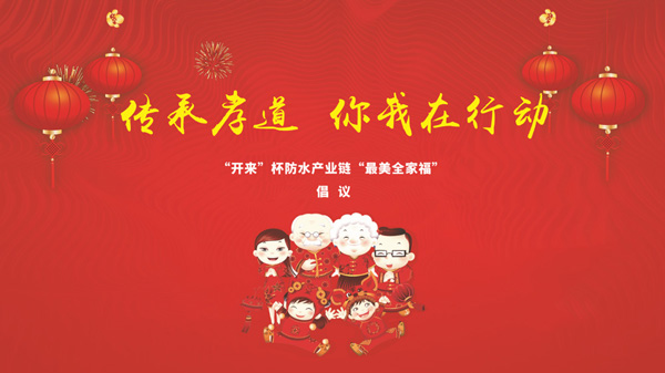 由中國建設報、中國防水產業鏈交流平臺主辦,由上海市化學建材行業協會建筑防水分會、河南省建筑防水協會、湖北省建筑防水協會、江西省建筑業協會防水分會、吉林省建筑防水協會、河北省建筑防水協會、海南省建筑滲漏治理協會、平輿建筑防水協會、石首市建筑防水行業協會、青島市建筑防水保溫協會、開來濕克威防水科技股份有限公司黨支部聯合承辦的傳承孝道,感恩有您!第一屆開來杯防水產業鏈“最美全家福”評選活動2019年2月1日開始,于2019年3月21日落下帷幕。