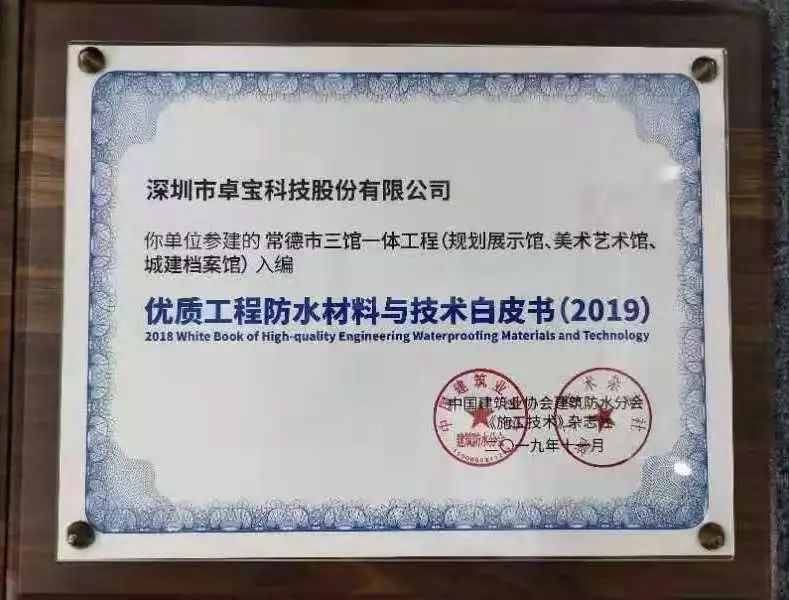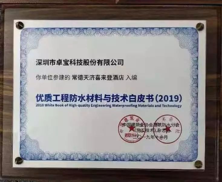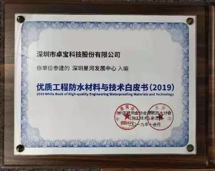據悉,《優質工程防水材料與技術白皮書(2019版)》的編撰采取企業自愿申報、協會審核、專家遴選的形式,匯集優質防水工程材料與技術成果。該書作為促進行業技術進步的重要載體,匯集了一批優質防水工程材料與技術成果,此次的入選是對卓寶施工質量的認可。
