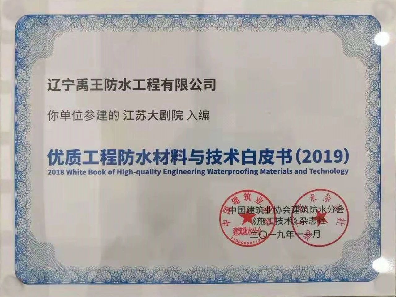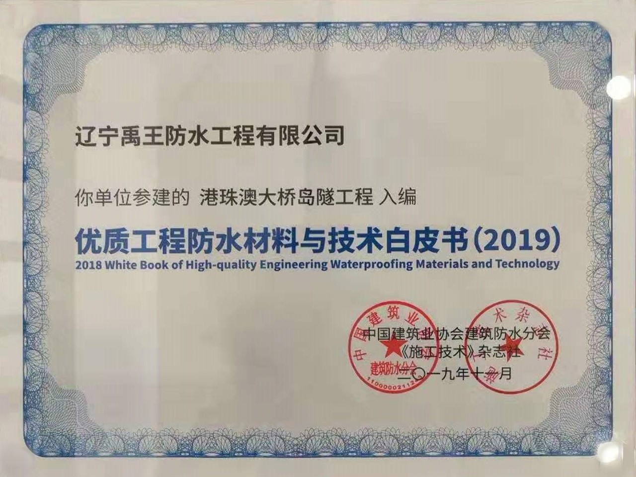 北新禹王憑借世界級工程“港珠澳大橋島隧工程”項目及“江蘇大劇院工程”再次成功入編《優質防水工程材料與技術白皮書(2019)》。