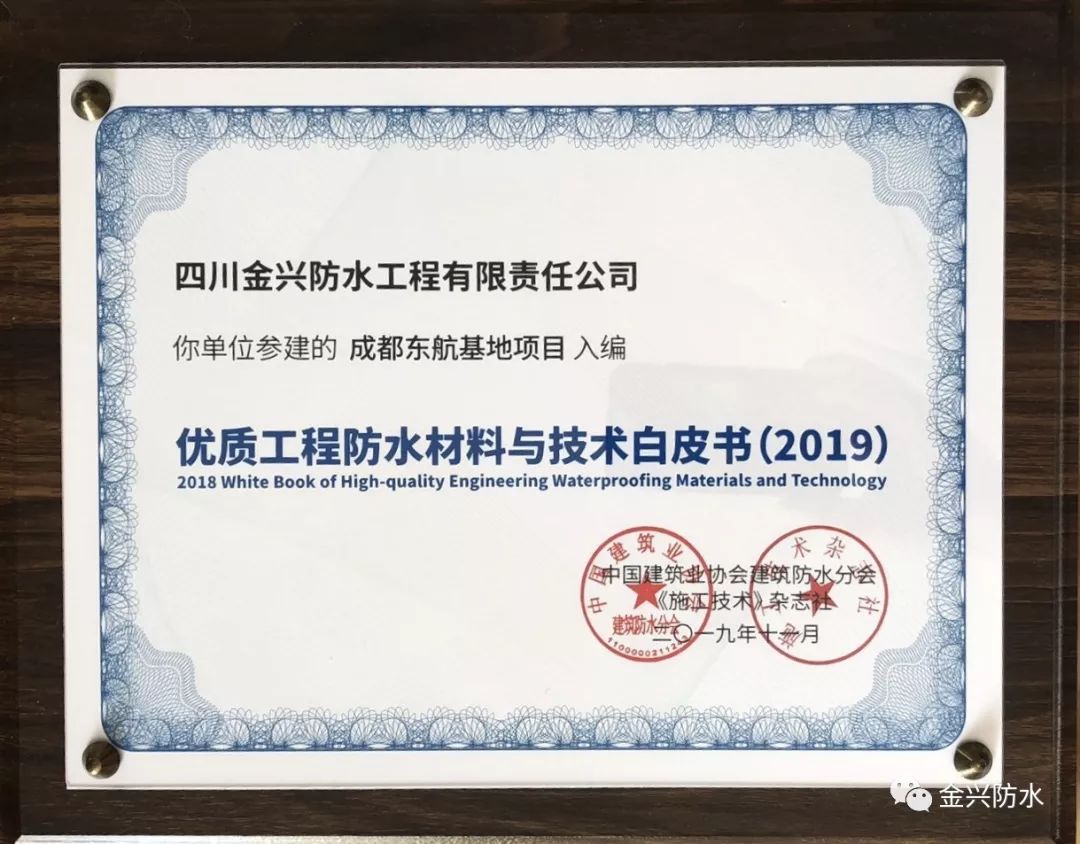 本次金興防水入選《白皮書》的成都東航基地項目,位于四川雙流航空港,由地下室、裙房和塔樓組成,其中地下室共2層,裙房2-3層為商場及辦公,用地面積約5.9萬平方米、總建筑面積約22.8萬平方米、防水工程面積7萬平方米,先后獲得2016年度“先進集體”、2017年度全國建筑業綠色建造暨綠色施工示范工程等榮譽稱號。