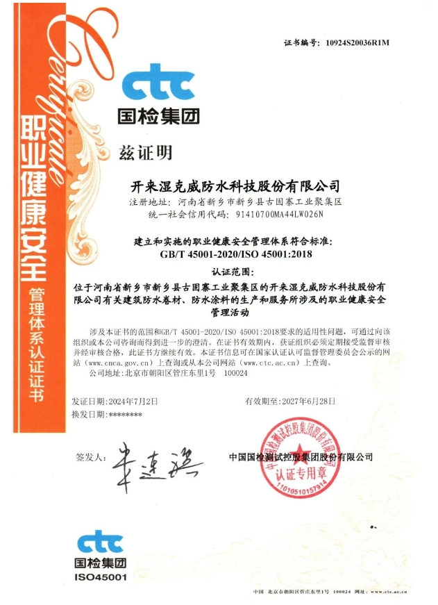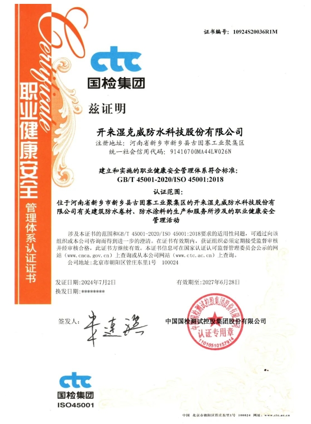 未來,開來濕克威將持續優化內部管理流程,健全管理體系,持續提升產品質量與客戶服務能力,為防水行業高質量發展貢獻力量。